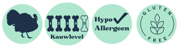 Kalkoenvlees is een lichte, magere en goed verteerbare eiwitbron, die vaak goed wordt verdragen door honden met allergieën of voedselgevoeligheden. Deze natuurlijke mono-proteïne snack bevat uitsluitend kalkoen – geen granen, kunstmatige stoffen of conserveringsmiddelen.
